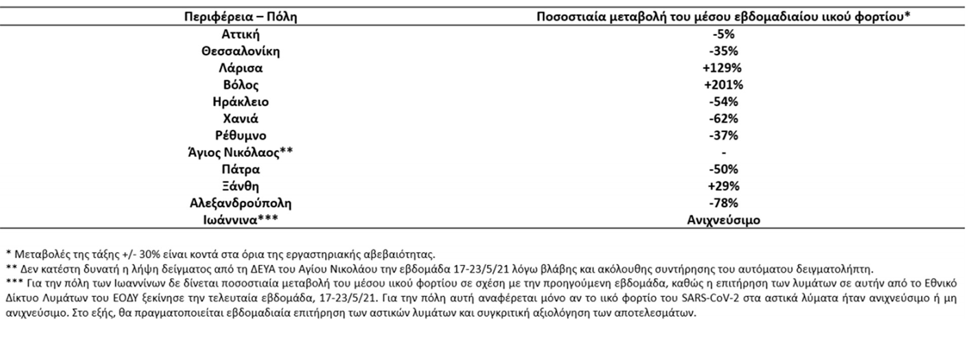 Οι καθαρά πτωτικές μεταβολές κυμάνθηκαν από -78% στην Αλεξανδρούπολη έως -35% στη Θεσσαλονίκη, ενώ σταθερό παρέμεινε ουσιαστικά το ιικό φορτίο στην Περιφέρεια Αττικής, παρουσιάζοντας μη σημαντική μεταβολή (-5%). Τρεις από τις δώδεκα περιοχές του Εθνικού Δικτύου Επιδημιολογίας Λυμάτων του ΕΟΔΥ παρουσίασαν αυξητικές τάσεις. Καθαρά αυξητικές τάσεις παρατηρήθηκαν στη Λάρισα (+129%) και στο Βόλο (+201%), ενώ οριακή ήταν η αύξηση στην Ξάνθη (+29%). Στον Άγιο Νικόλαο δεν ήταν δυνατή η δειγματοληψία και συνεπώς δεν υπάρχουν αποτελέσματα για την εβδομάδα 17-23/5/21. Τέλος, ανιχνεύθηκε ιικό φορτίο στα αστικά λύματα των Ιωαννίνων, οι μετρήσεις των οποίων προστέθηκαν στο Εθνικό Δίκτυο Επιδημιολογίας Λυμάτων του ΕΟΔΥ την τελευταία εβδομάδα.