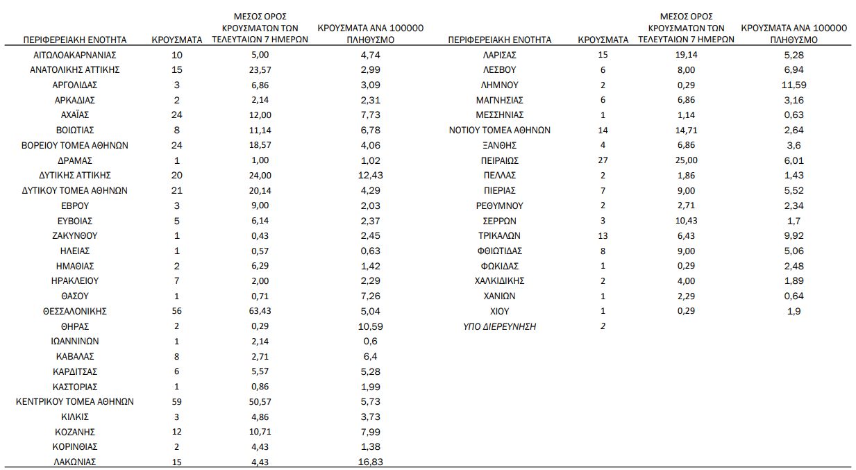 Η ενημέρωση του ΕΟΔΥ: «Σήμερα ανακοινώνουμε 444 νέα κρούσματα της λοίμωξης του νέου κορωνοϊού (COVID-19), εκ των οποίων 12 εντοπίστηκαν κατόπιν ελέγχων στις πύλες εισόδου της χώρας. Ο συνολικός αριθμός των κρουσμάτων ανέρχεται στα 145179, εκ των οποίων 52.2% άνδρες. Κατά την ιχνηλάτιση βρέθηκε ότι 5630 (3.9%) θεωρούνται σχετιζόμενα με ταξίδι από το εξωτερικό και 43957 (30.3%) είναι σχετιζόμενα με ήδη γνωστό κρούσμα.