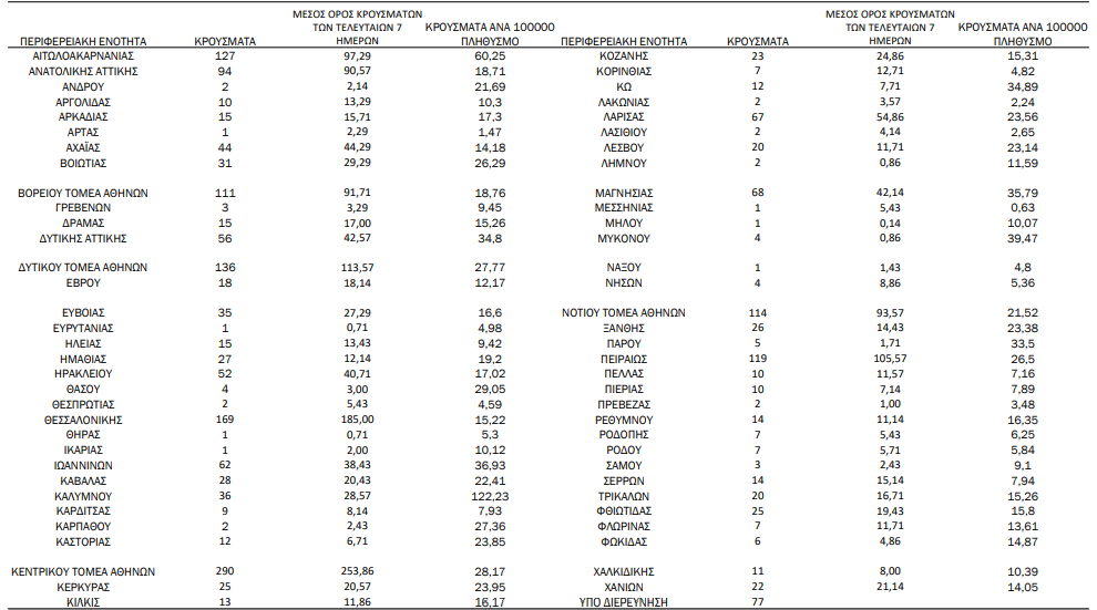Η ενημέρωση: Τα νέα εργαστηριακά επιβεβαιωμένα κρούσματα της νόσου που καταγράφηκαν τις τελευταίες 24 ώρες είναι 2.167, εκ των οποίων 3 εντοπίστηκαν κατόπιν ελέγχων στις πύλες εισόδου της χώρας. Ο συνολικός αριθμός των κρουσμάτων ανέρχεται σε 371.693 (ημερήσια μεταβολή +0.6%), εκ των οποίων 51.2% άνδρες. Οι νέοι θάνατοι ασθενών με COVID-19 είναι 55, ενώ από την έναρξη της επιδημίας έχουν καταγραφεί συνολικά 11.266 θάνατοι. Το 95.2% είχε υποκείμενο νόσημα ή/και ηλικία 70 ετών και άνω. Ο αριθμός των ασθενών που νοσηλεύονται διασωληνωμένοι είναι 683 (61.8% άνδρες). Η διάμεση ηλικία τους είναι 67 έτη. Το 82.9% έχει υποκείμενο νόσημα ή/και ηλικία 70 ετών και άνω. Από την αρχή της πανδημίας έχουν εξέλθει από τις ΜΕΘ 2.238 ασθενείς. Οι εισαγωγές νέων ασθενών Covid-19 στα νοσοκομεία της επικράτειας είναι 293 (ημερήσια μεταβολή -7.86%).