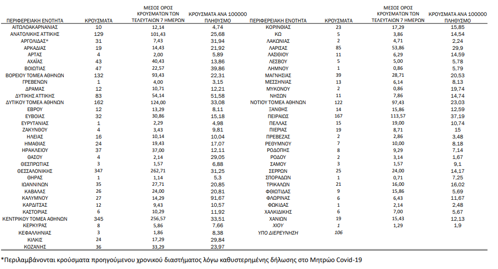 Τα νέα εργαστηριακά επιβεβαιωμένα κρούσματα της νόσου που καταγράφηκαν τις τελευταίες 24 ώρες είναι 2.435, εκ των οποίων 5 εντοπίστηκαν κατόπιν ελέγχων στις πύλες εισόδου της χώρας. Από το σύνολο της επικράτειας, τα 8 κρούσματα εντοπίστηκαν στην Περιφερειακή Ενότητα Ροδόπης, που την τελευταία εβδομάδα κατά μέσο όρο «δίνει» ημερησίως περί των 10 κρουσμάτων.