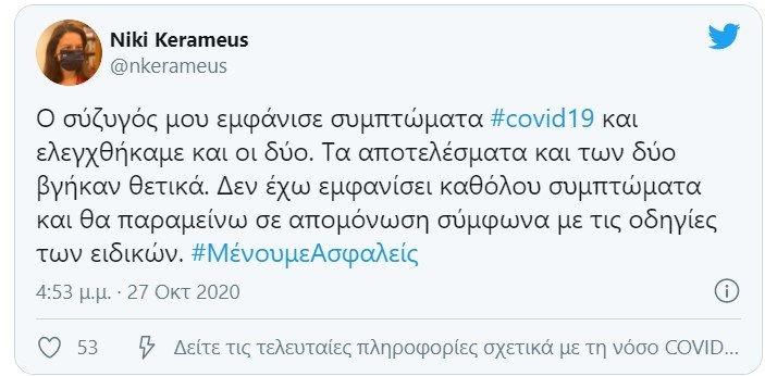 Έγραψε επί λέξει η υπουργός Παιδείας: «Ο σύζυγός μου εμφάνισε συμπτώματα #covid19 και ελεγχθήκαμε και οι δύο. Τα αποτελέσματα και των δύο βγήκαν θετικά. Δεν έχω εμφανίσει καθόλου συμπτώματα και θα παραμείνω σε απομόνωση σύμφωνα με τις οδηγίες των ειδικών».