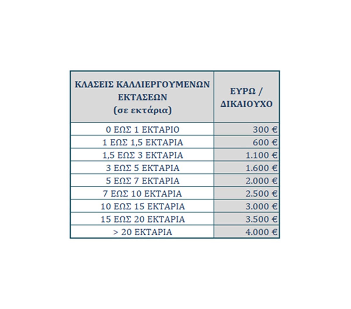 Η συνολική συγχρηματοδοτούμενη ενίσχυση, που προβλέπεται να χορηγηθεί στους δικαιούχους, ανέρχεται σε 126,3 εκατομμύρια ευρώ και αφορά κατ’ αποκοπή εφάπαξ ποσό σύμφωνα με τις ακόλουθες κλάσεις (με βάση την έκταση που αυτοί εμπίπτουν, αθροιστικά για ελιά ελαιοποιήσιμη ή/και διπλής κατεύθυνσης):