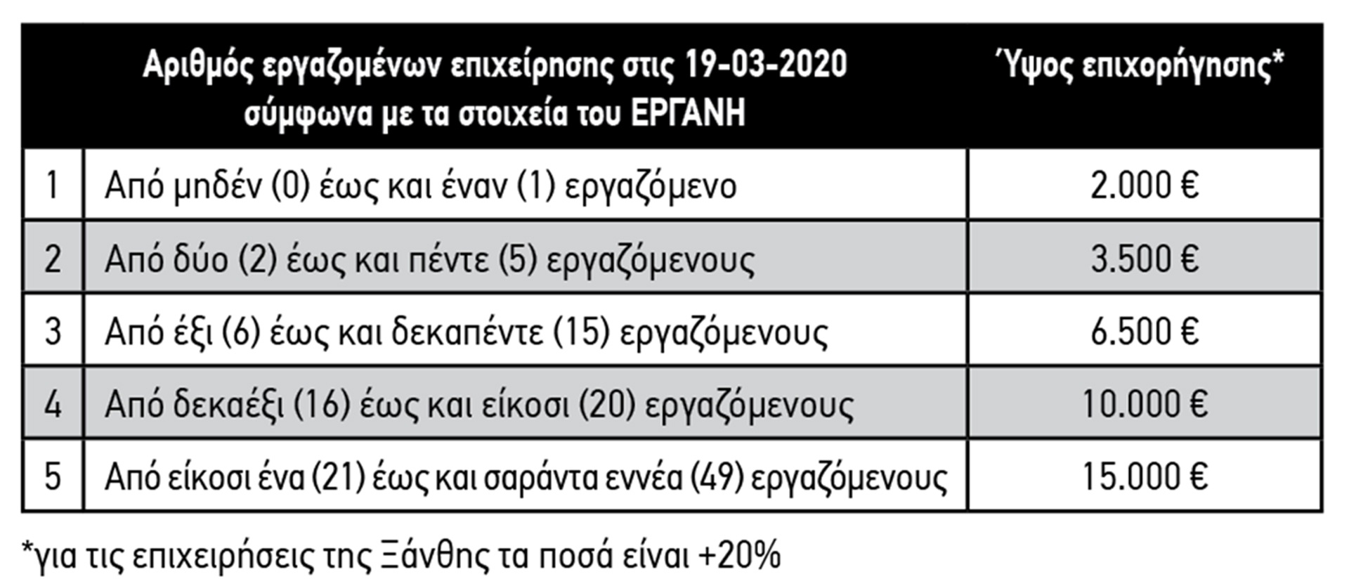 Ο περιφερειάρχης γνωστοποίησε πως η επιχορήγηση θα κυμαίνεται από 2.000€ έως 15.000€, ανάλογα με τον αριθμό των εργαζομένων που είχε κάθε επιχείρηση στην αρχή της πανδημίας. Αναλυτικά η κατανομή των ποσών στον πίνακα που ακολουθεί: